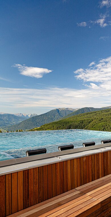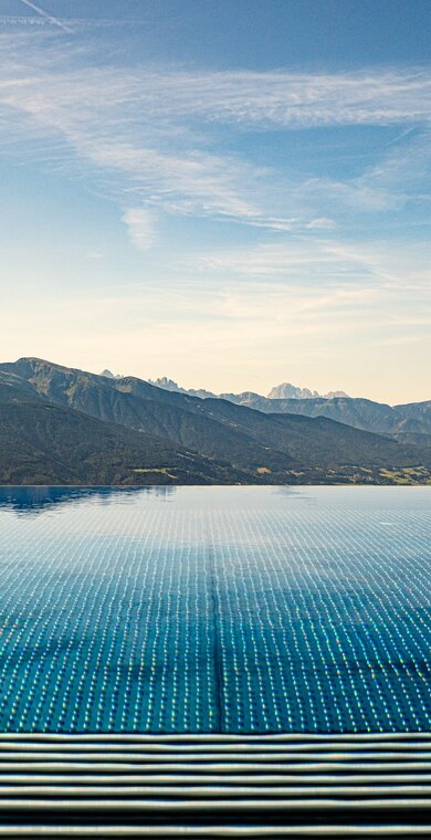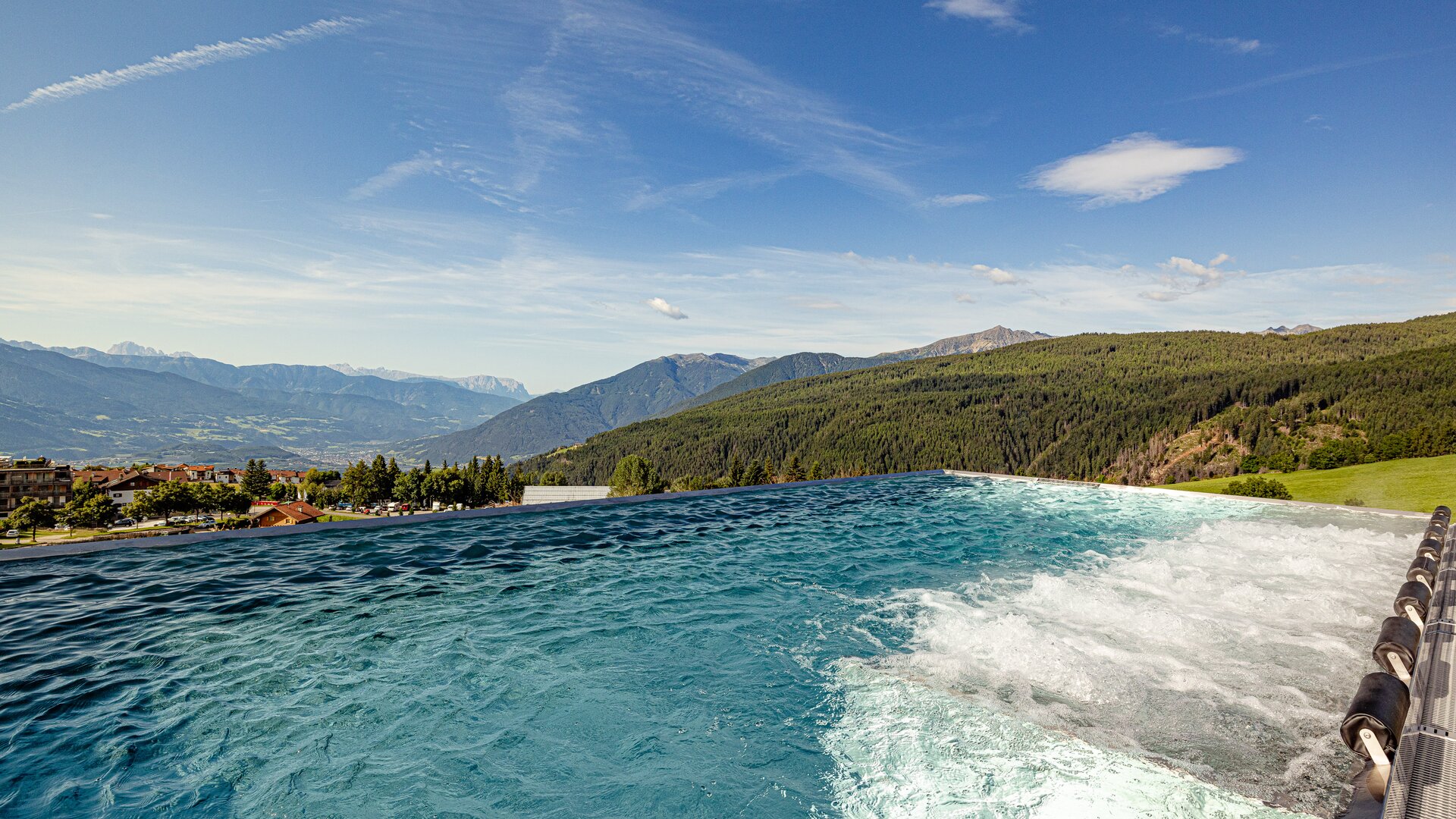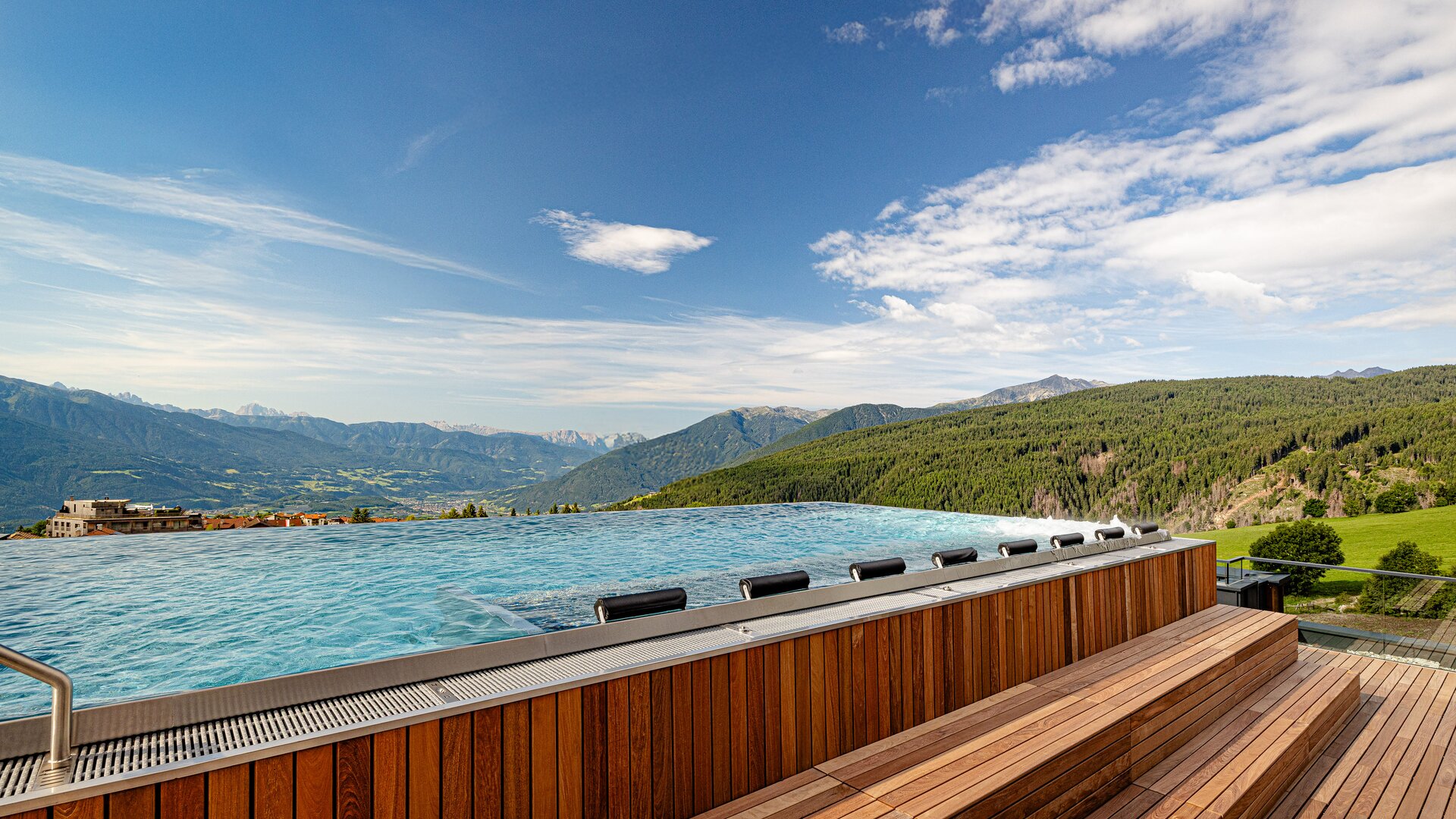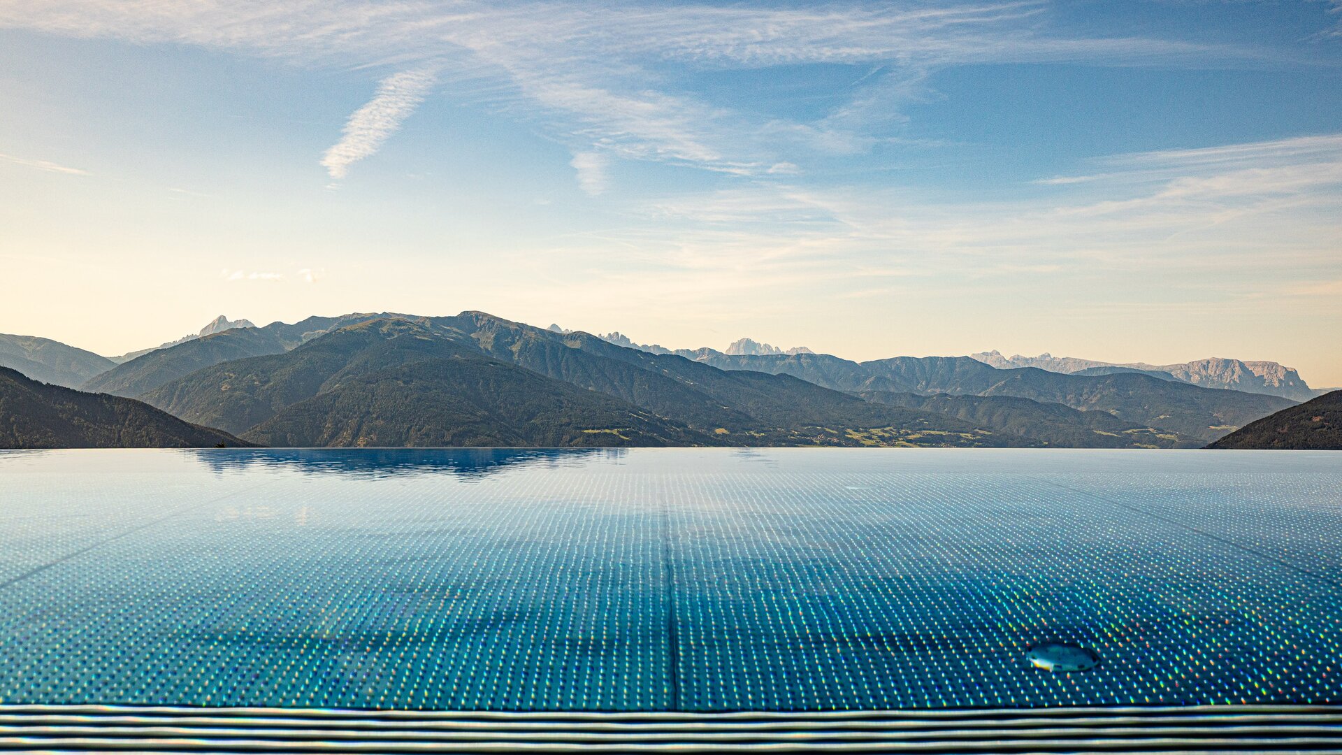 Wellen kräuseln sich sanft. Dampf steigt auf. Der Horizont verschwimmt. Im Sonnenberg, Ihrem Wellnesshotel in Meransen, verschmilzt Luxus mit alpiner Kraft. Spüren Sie die Energie der Südtiroler Berge in jedem Wassertropfen.