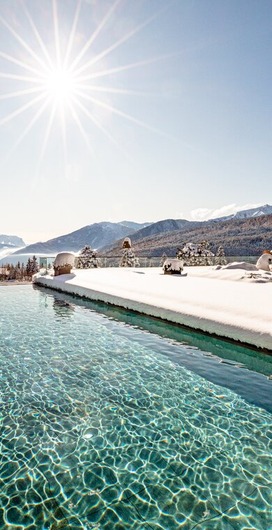 Wellen kräuseln sich sanft. Dampf steigt auf. Der Horizont verschwimmt. Im Sonnenberg, Ihrem Wellnesshotel in Meransen, verschmilzt Luxus mit alpiner Kraft. Spüren Sie die Energie der Südtiroler Berge in jedem Wassertropfen.