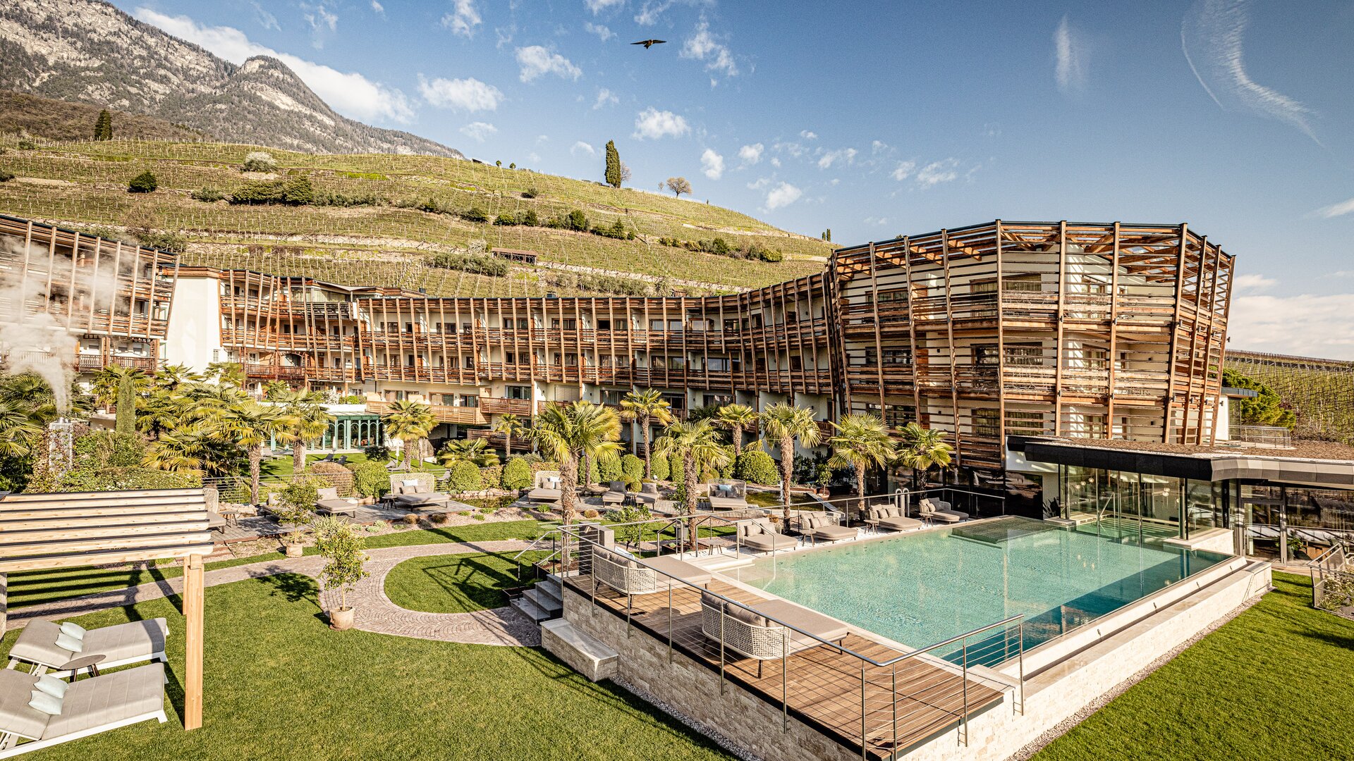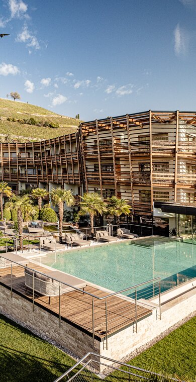 Sie wohnen in luxuriösen Suiten. Drinnen träumen. Das Außen im Blick. Die Sonne. Das Licht. Die Palmen. Sich schwerelos fühlen im mediterranen Gartenbereich. Im neuen Naturbadeteich und Adults Only Indoor-Outdoor Infinity Pool erfrischen. Ausspannen in der Spawelt. Herrlich! Besondere Highlights sind die exklusiven Privatstrände am Kalterer See und das eigene Weingut samt Handwerksbrauerei. Weitläufige Weinberge. Smaragdgrünes Wasser. Erleben Sie unvergessliche Momente in dieser märchenhaften Idylle. Nie war Ruhe lebendiger.
