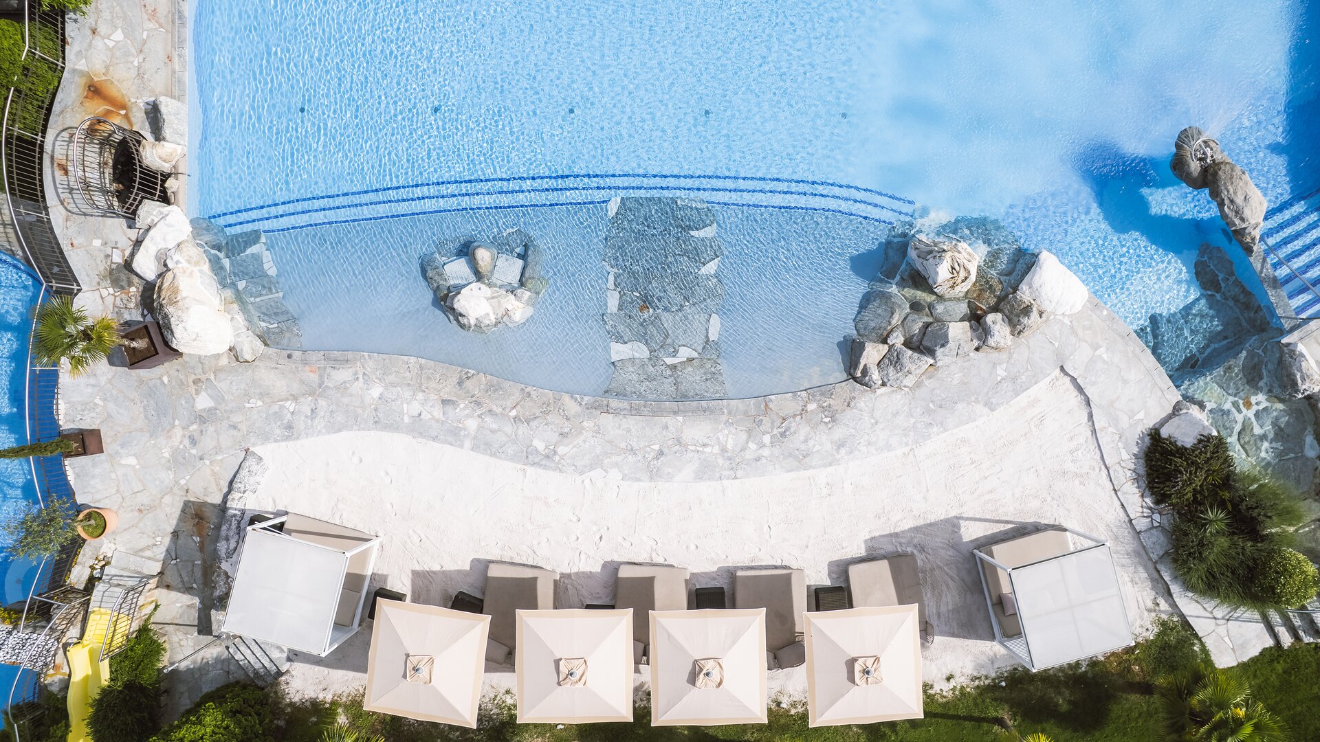 Surrounded by sun-drenched vineyards and overlooking the mountains of South Tyrol, the Weinegg Wellviva Resort is an exclusive wellness hotel in South Tyrol where alpine lightness blends seamlessly with Mediterranean joie de vivre. Six turquoise pools, including the 60-metre-long, year-round heated suitenPOOL with direct access from the poolSUITES featuring private Finnish saunas, as well as the indoor-outdoor infinity pool with panoramic opening, make the resort a truly exceptional destination for a wellness holiday in South Tyrol. The outdoor adventure pool with white sandy beach adds a genuine holiday atmosphere.