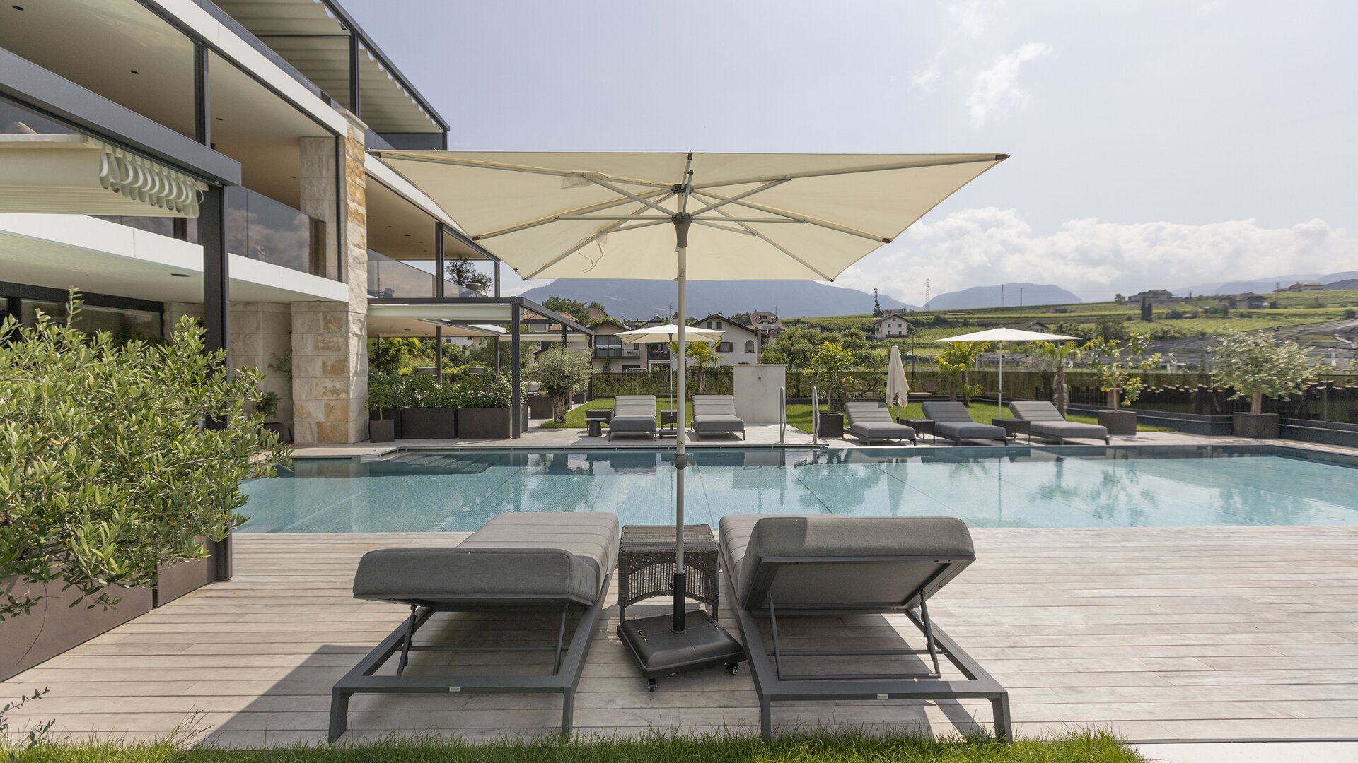Surrounded by sun-drenched vineyards and overlooking the mountains of South Tyrol, the Weinegg Wellviva Resort is an exclusive wellness hotel in South Tyrol where alpine lightness blends seamlessly with Mediterranean joie de vivre. Six turquoise pools, including the 60-metre-long, year-round heated suitenPOOL with direct access from the poolSUITES featuring private Finnish saunas, as well as the indoor-outdoor infinity pool with panoramic opening, make the resort a truly exceptional destination for a wellness holiday in South Tyrol. The outdoor adventure pool with white sandy beach adds a genuine holiday atmosphere.